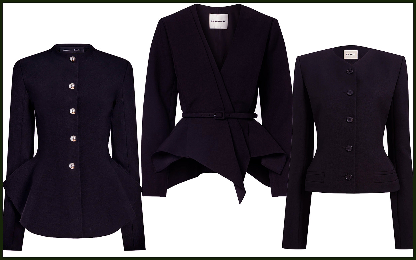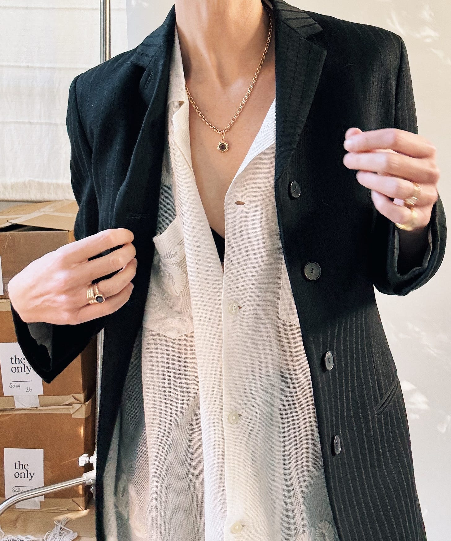 The blazers I’m drawn to – I realized after trying many – have some structure and feel distinctly feminine. Collared or not, they are undoubtedly elegant, and of course they fit very well. If they are expensive (and they are) it’s because they are held up by a level of construction far exceeding that of, say, a sweater, or even a pair of jeans. (The shoulder on that Chloé blazer is round and padded, guys.) You have to just trust me when I tell you that the fabrics here are all sublime. And soft to the touch. And lined, which always ups the cost. I don’t know, I really splurged on these (and I’m not keeping them all, good god), but I am actually a grown up now – I don’t need a blazer to feel like one – and that means knowing quality when I see it.