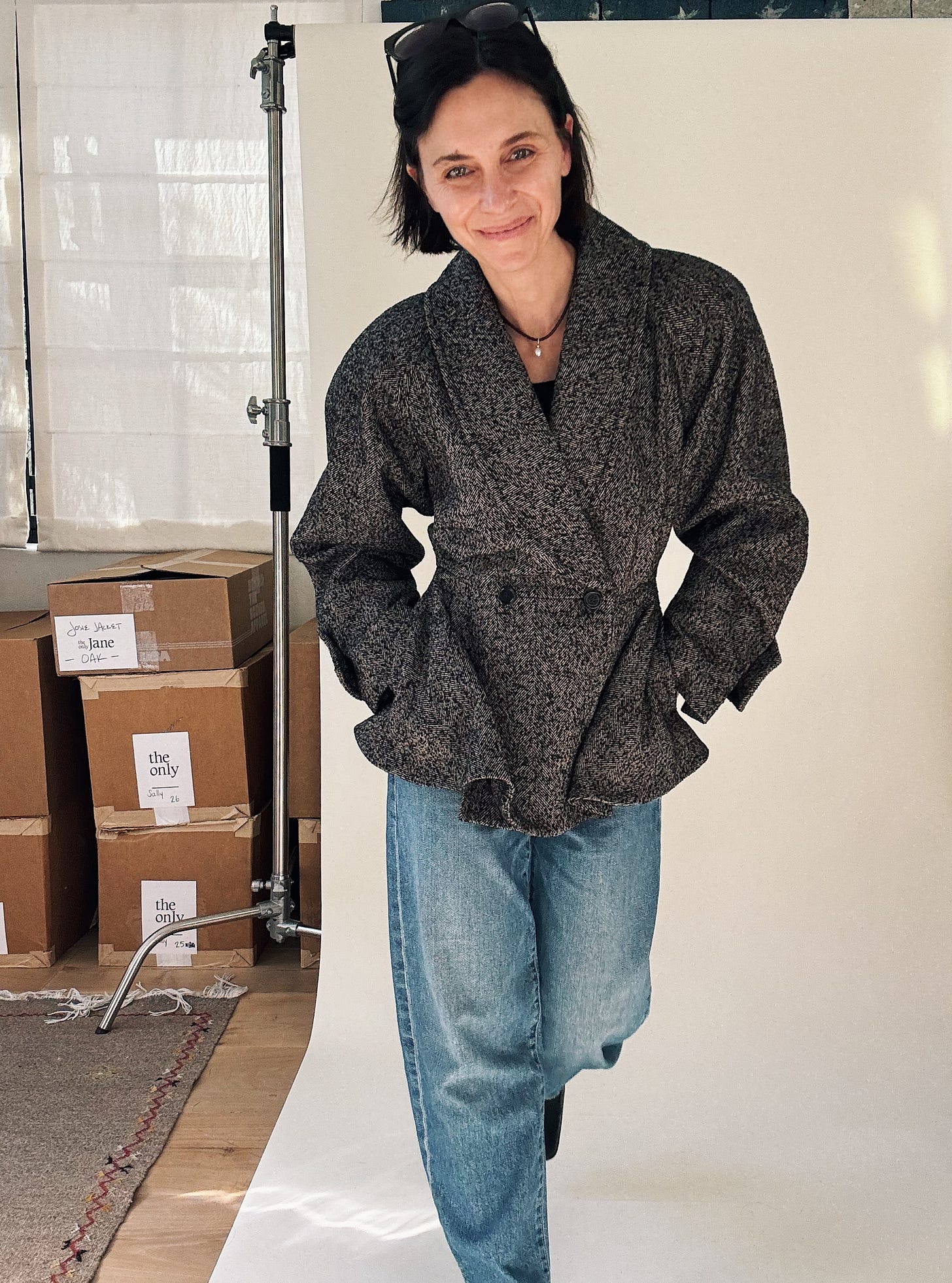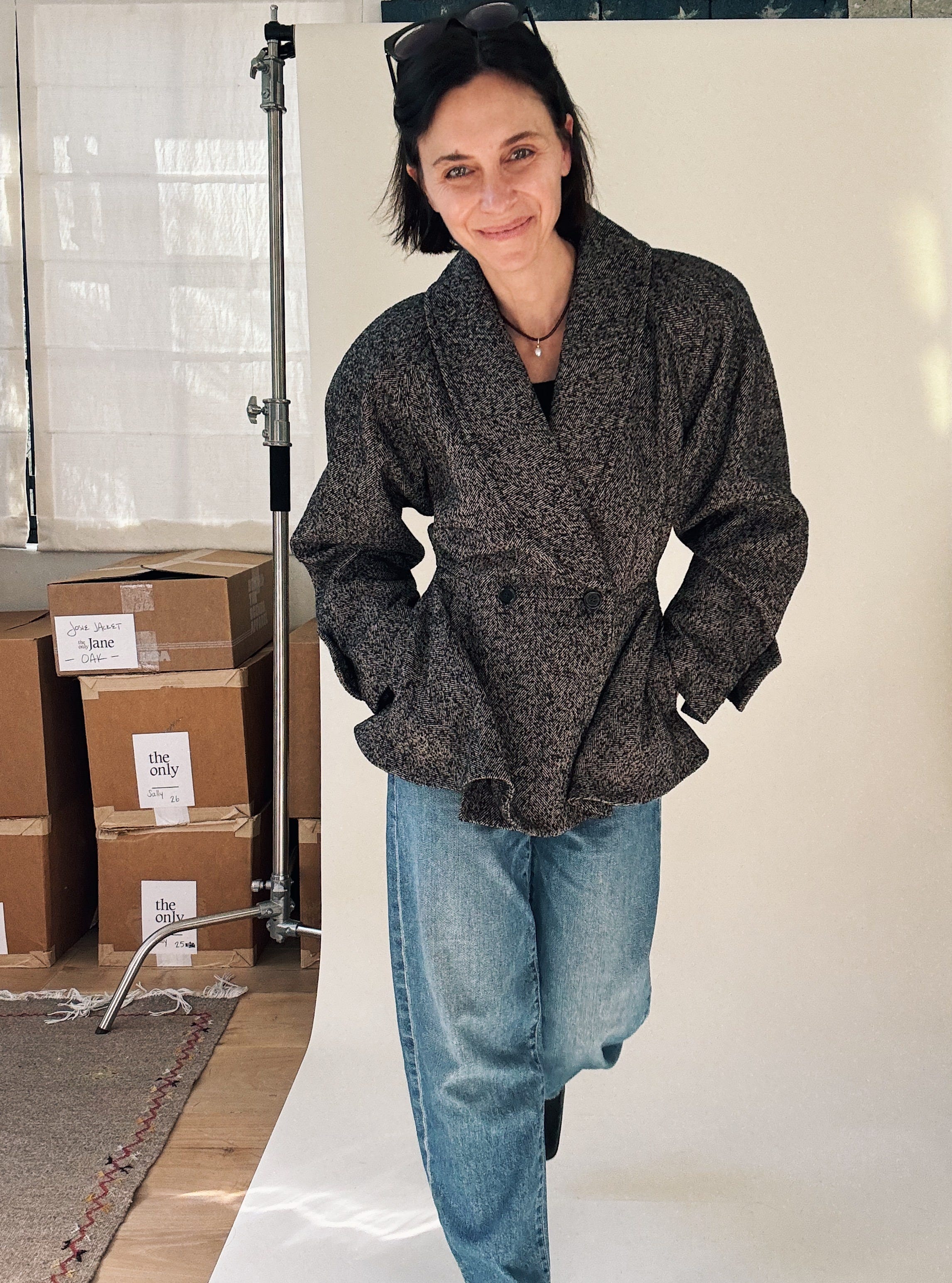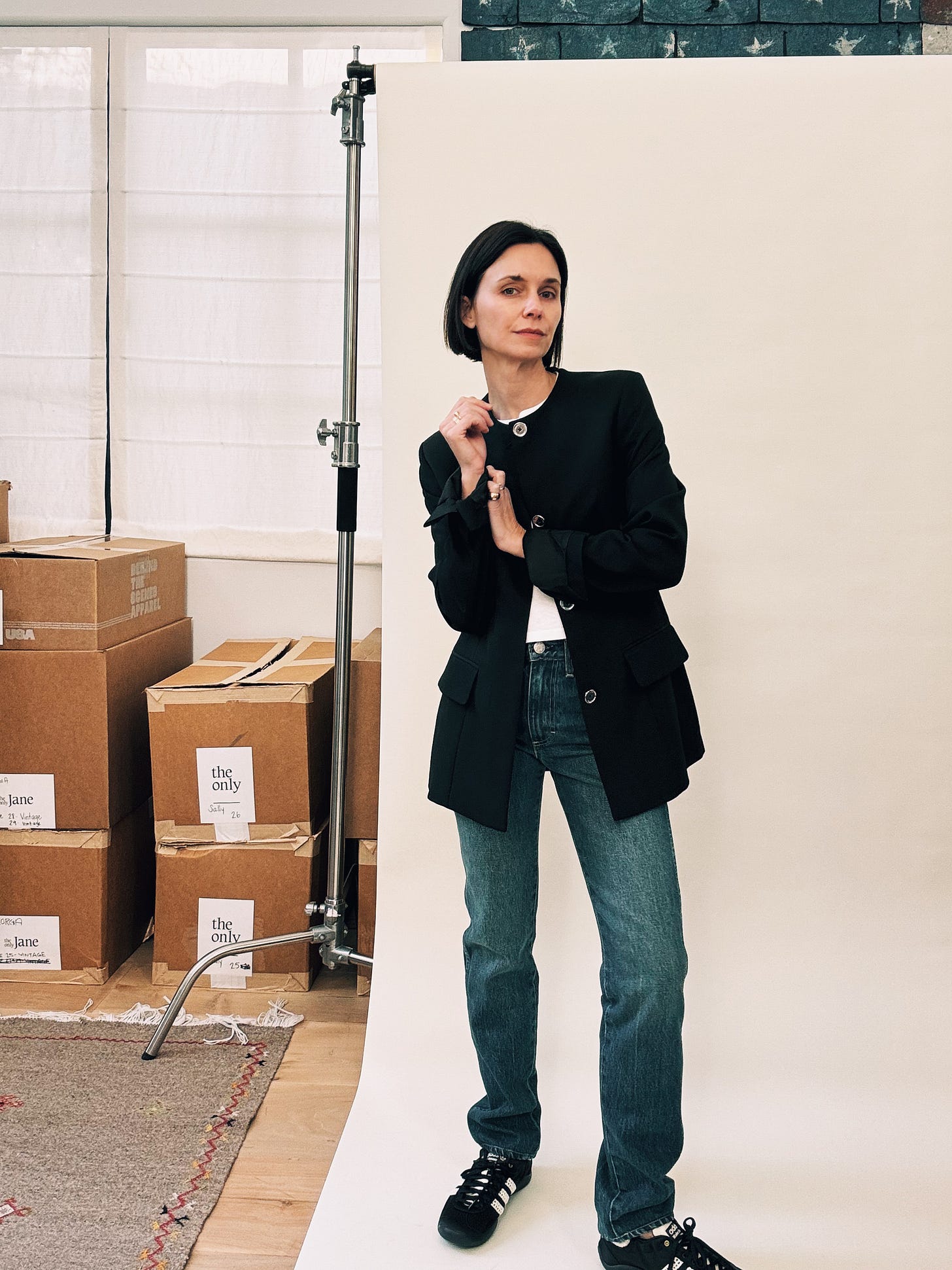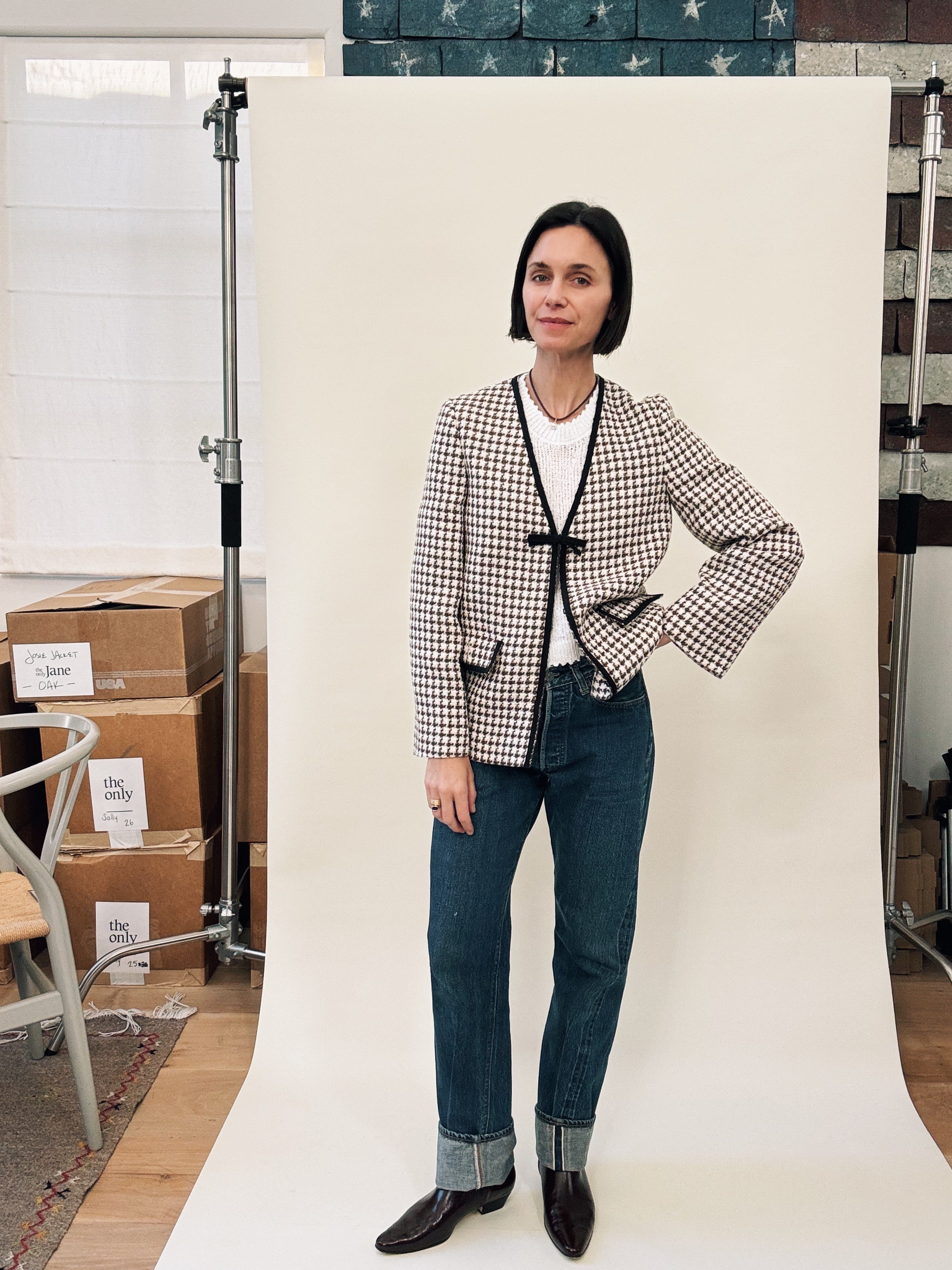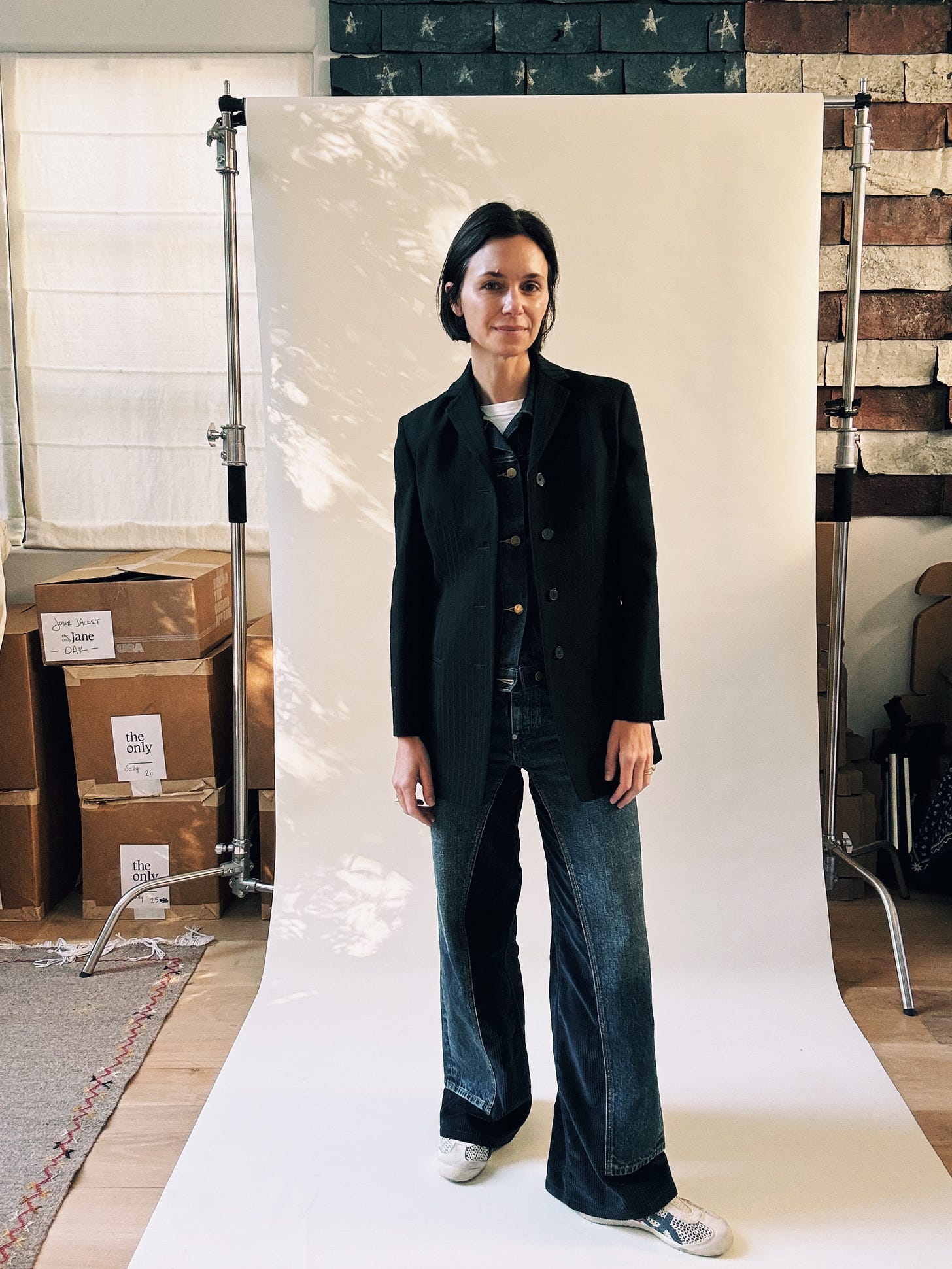 Total side note: The flag behind my seamless was a set piece designed by Mark Friedberg for the The Amazing Spiderman 2, which my husband Marc directed. It was made for Mary Jane’s garage, and though it didn’t end up appearing in the film, it did make it across the country, from our home in New York to my studio in L.A. I love it and – jeans being an authentic American thing – love how it looks in my little world of denim. (And blazers.)