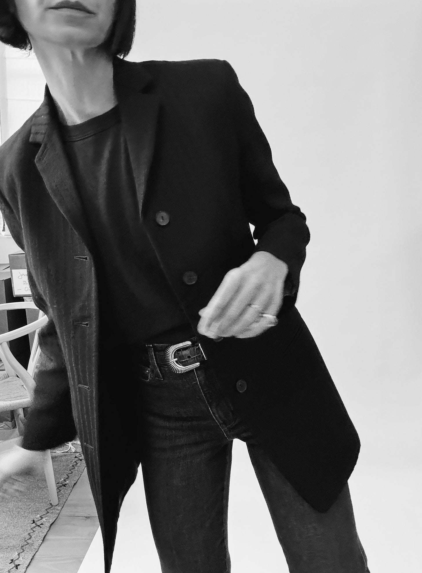 I’m telling you, the moment I quit trying to make “looks,” I understood the assignment. A blazer is a layer. It sounds so simple when I say it, but I had to get past my former relationship with this type of jacket (dress to impress!) in order to wear any of them anew. Some other examples of how I layer my new favorite blazer with everything I already love: Over a slightly sheer Bode shirt (above), and with my workhorse uniform – bootcut jeans, black t-shirt, belt (below).