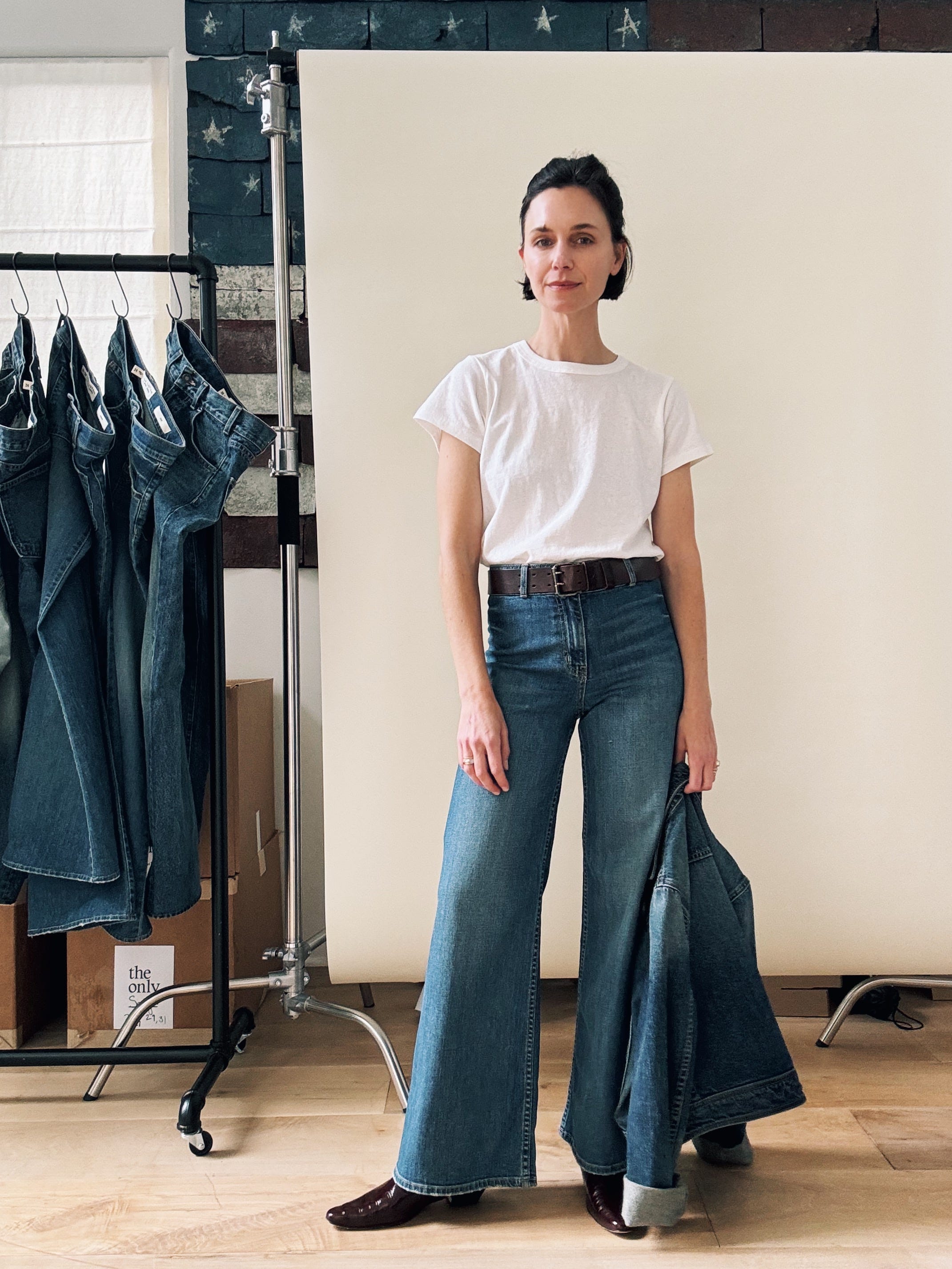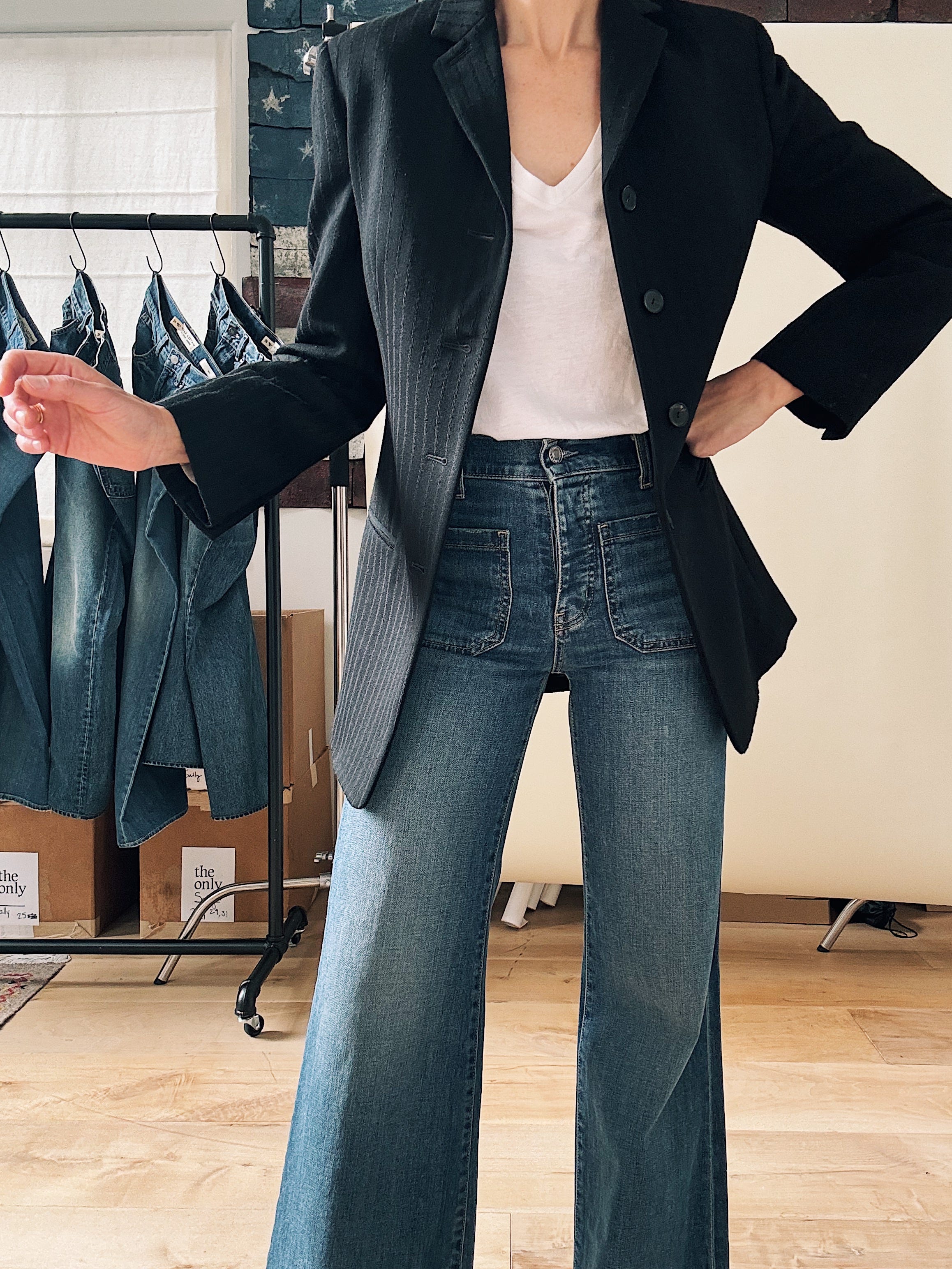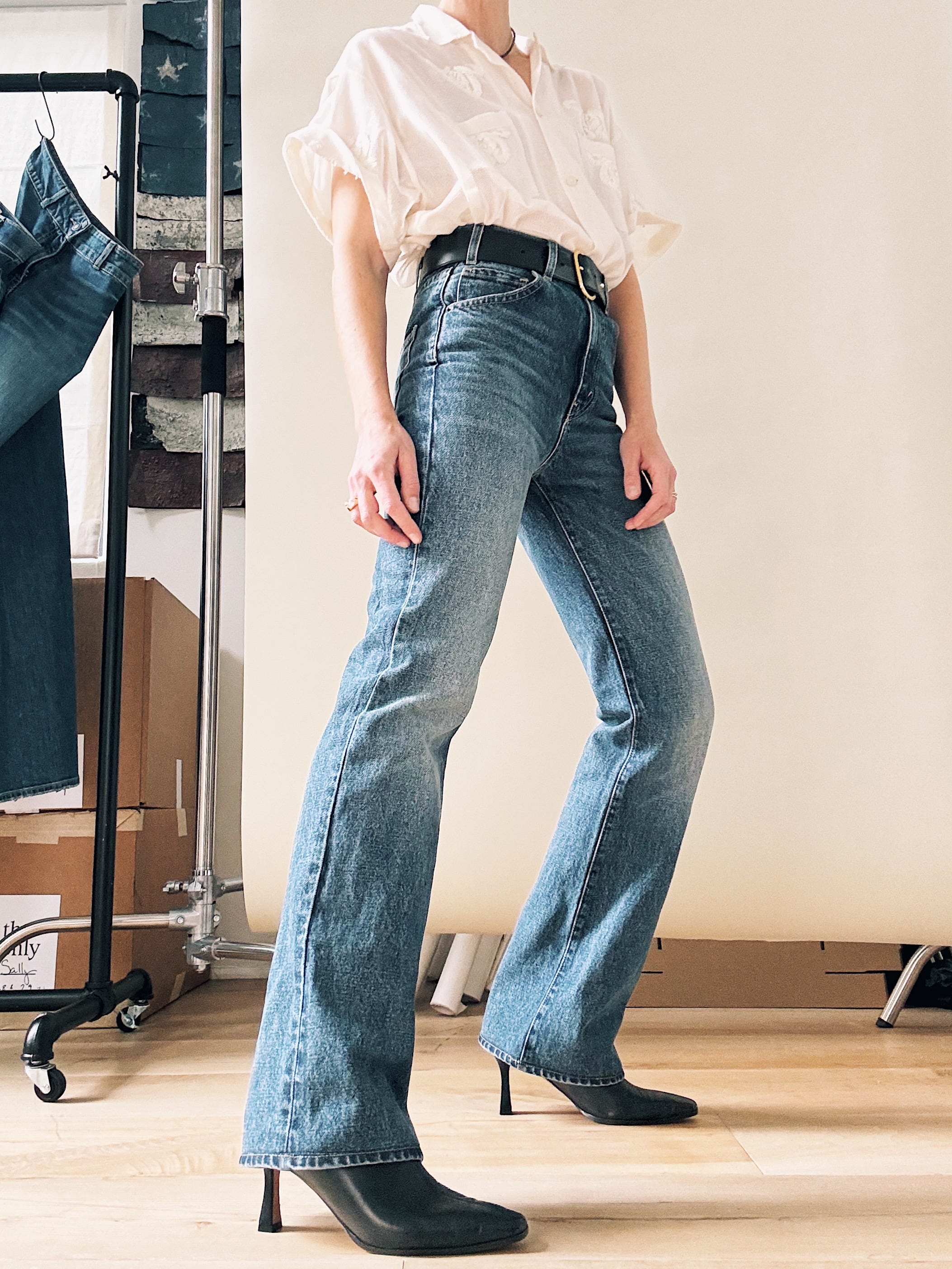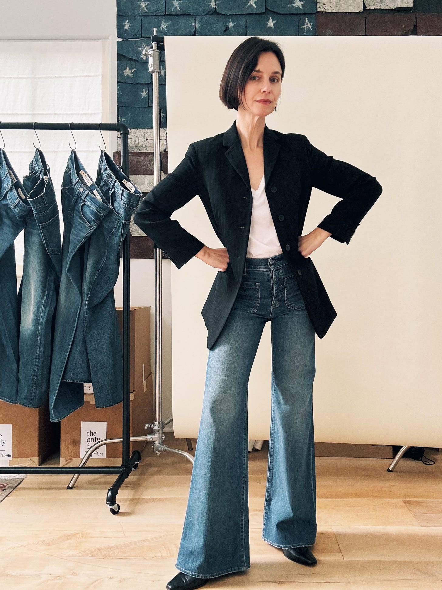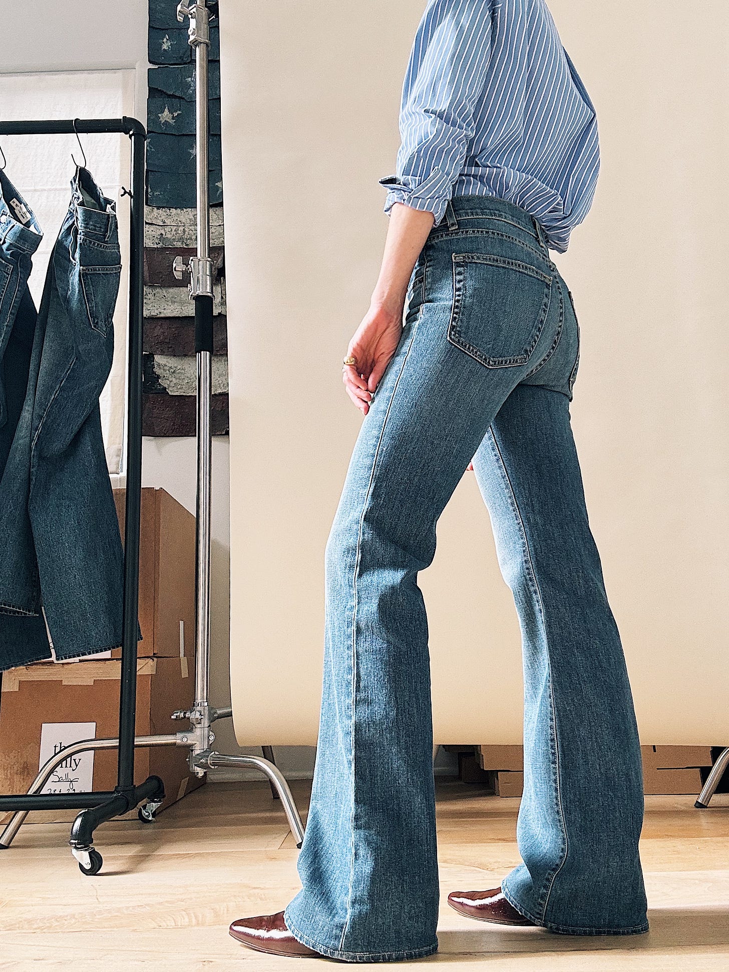 Now. I’m not suggesting we wear Celia with a flat sneaker (readers know that flares and trainers are a major Don’t for me), but with a high heel, the curvy leg turns too male-gaze for my taste. What I love about Nili’s jeans is the line they blur between masculine and feminine. (She told me herself that women buy her guy’s jeans and guys wear her women’s jeans, and “it doesn’t really matter.”) With a pin-stripe shirt and low-heeled boot, I get the mens-y energy that makes Celia (and her muse, Jane) so sexy.