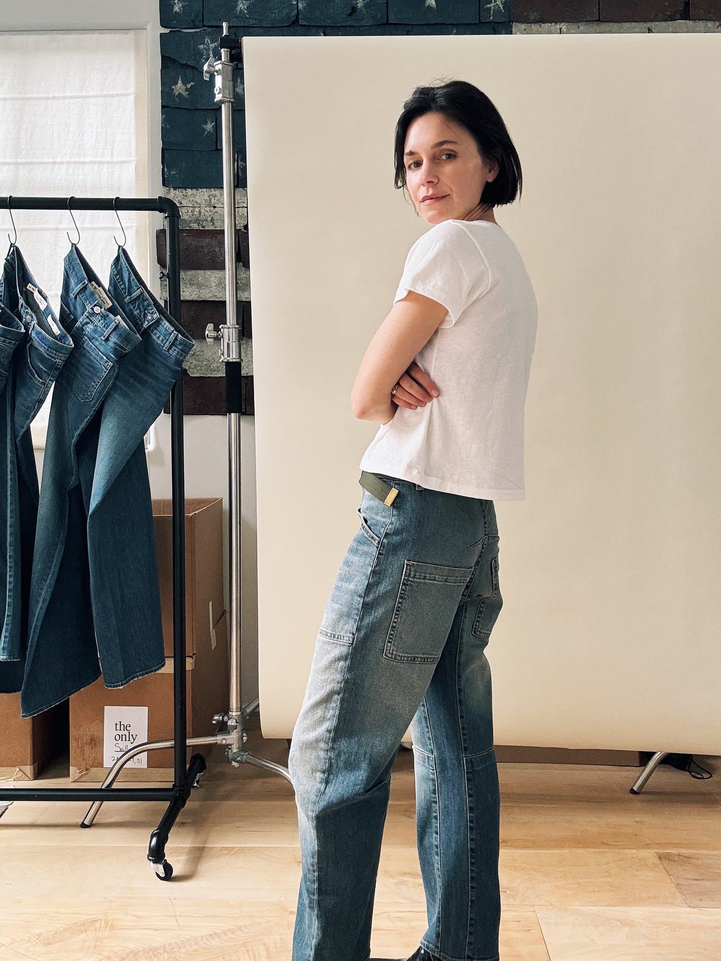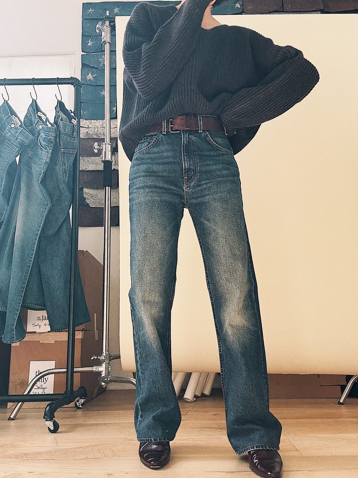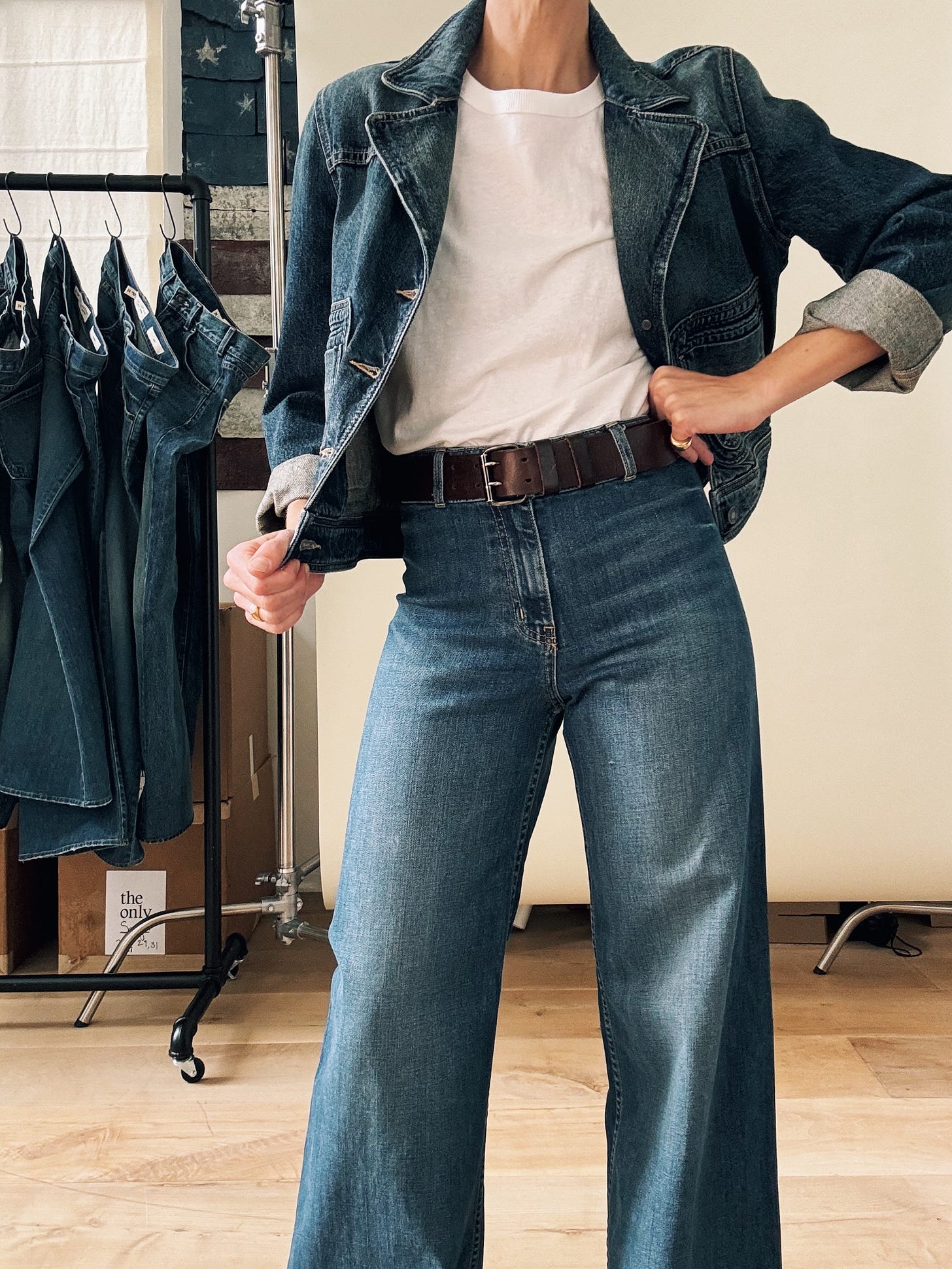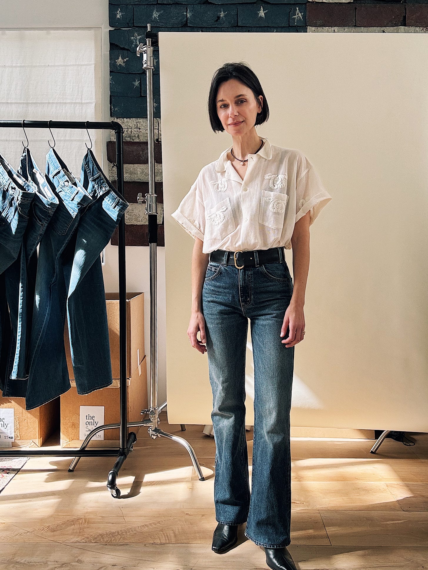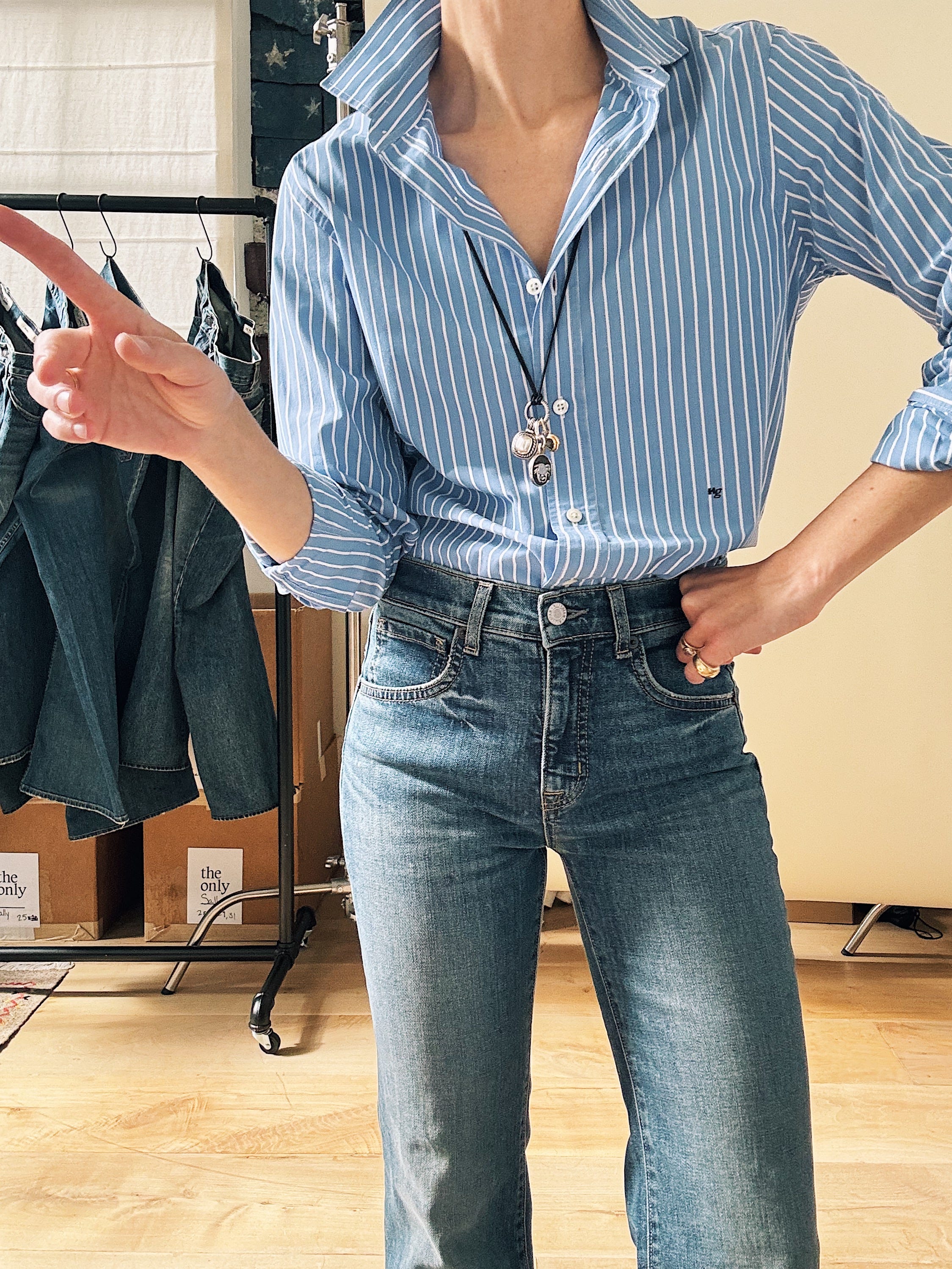 Now. I’m not suggesting we wear Celia with a flat sneaker (readers know that flares and trainers are a major Don’t for me), but with a high heel, the curvy leg turns too male-gaze for my taste. What I love about Nili’s jeans is the line they blur between masculine and feminine. (She told me herself that women buy her guy’s jeans and guys wear her women’s jeans, and “it doesn’t really matter.”) With a pin-stripe shirt and low-heeled boot, I get the mens-y energy that makes Celia (and her muse, Jane) so sexy.