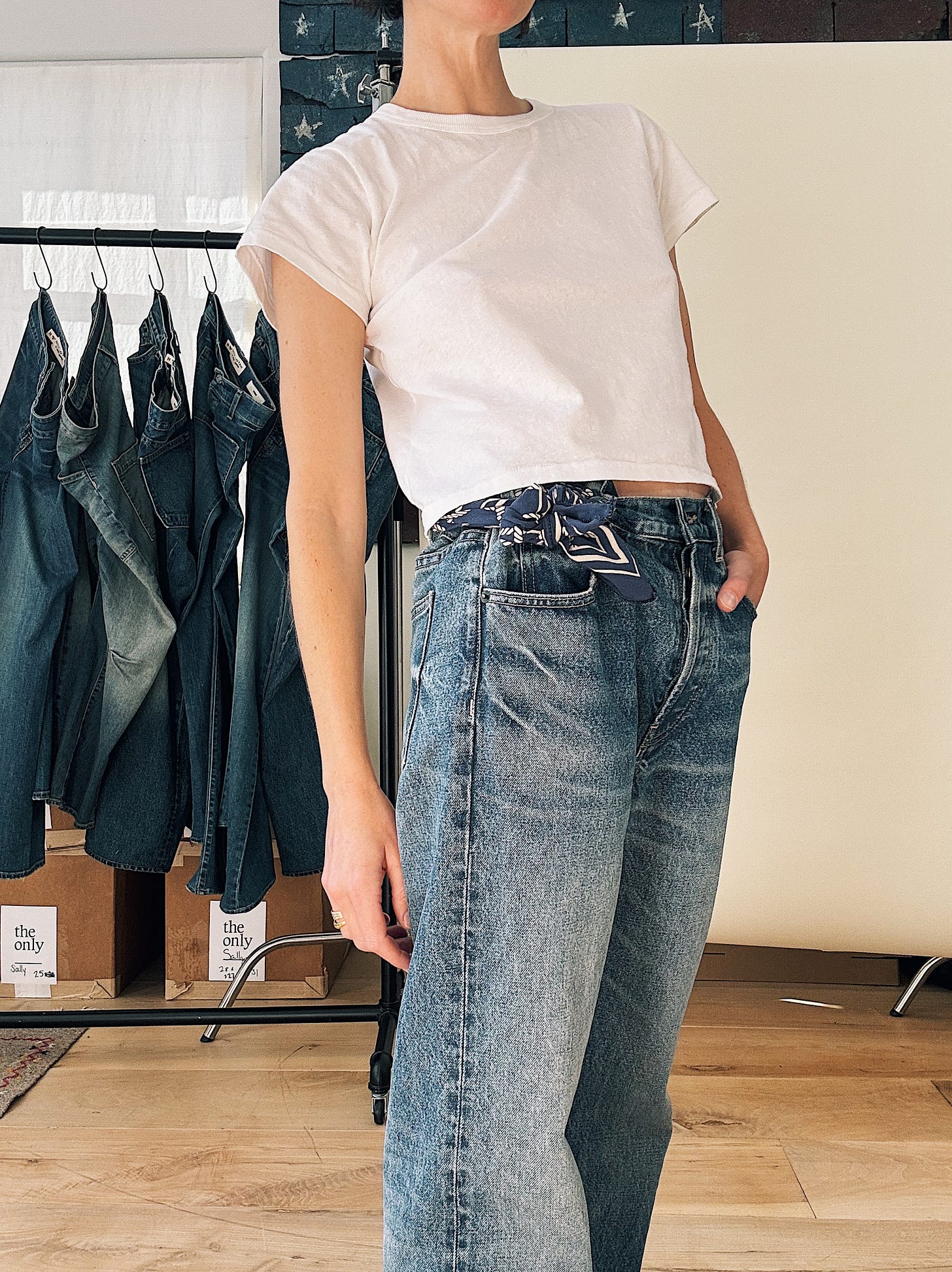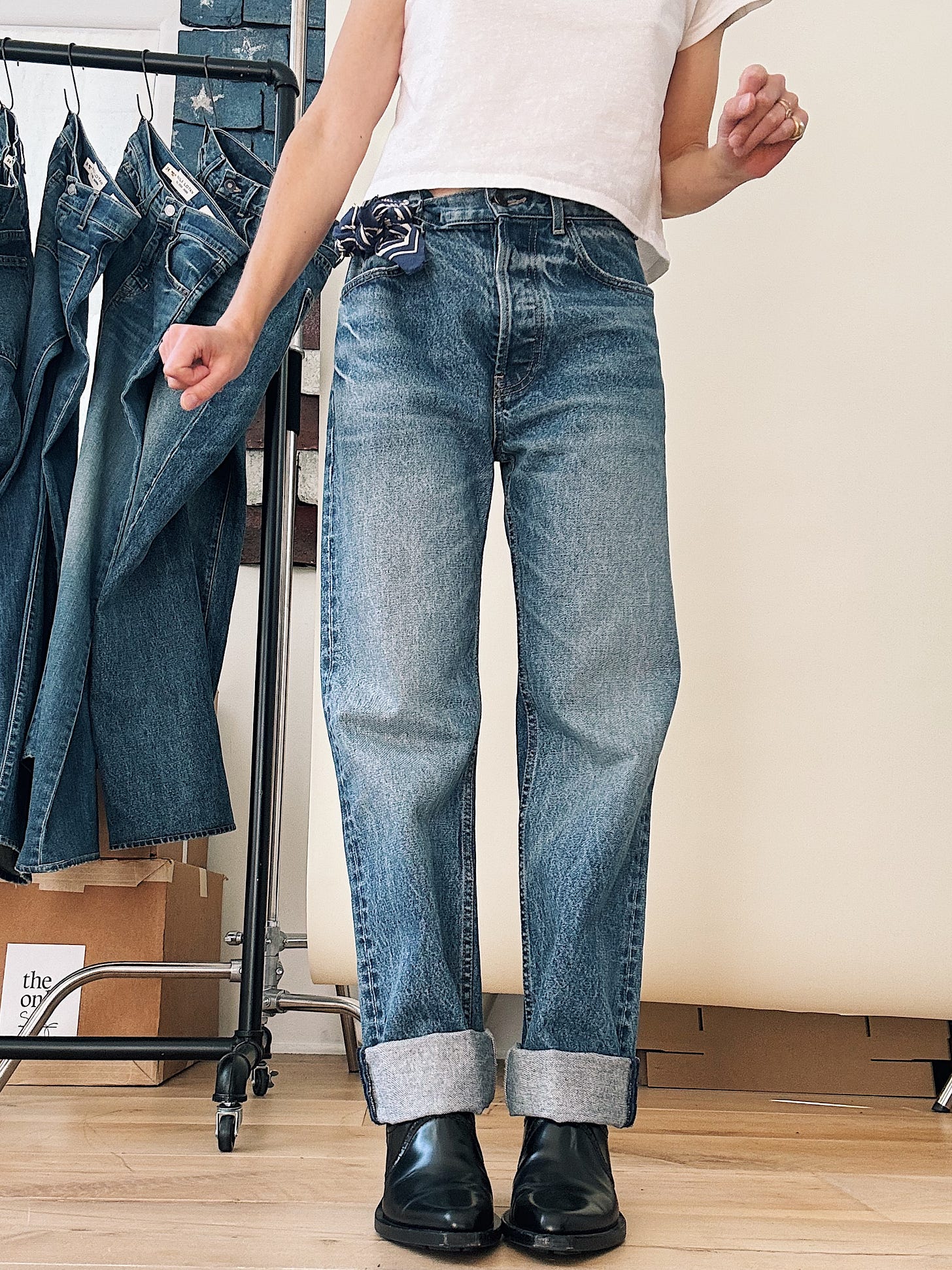 Here, I’m wearing a size 27, cinched with a bandana tied through the three right-side loops. I’ve cuffed the hems, just as I do with my beloved Levi’s Big E’s. As someone who wears vintage men’s 501s most days of her life – ranging from waist size 29 - 31 – this jean feels completely me. Like my haircut. A sheer matter of fact.